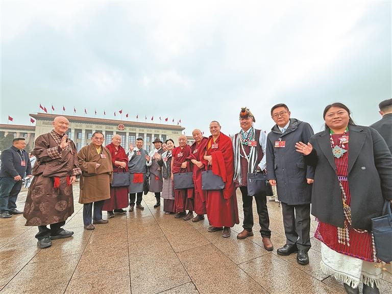 出席全國政協十四屆四次會議的部分住藏全國政協委員在人民大會堂前合影。記者 旦增旺姆 陶玥 瑯青措 攝