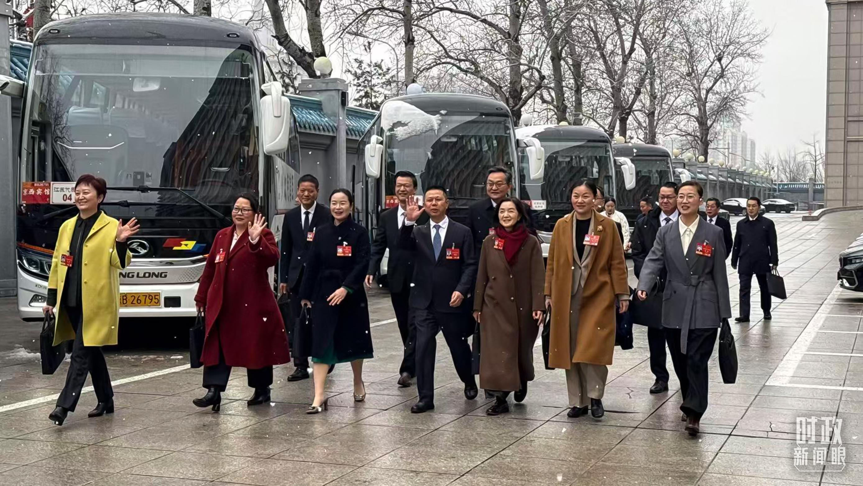 △江蘇代表團乘車前往人民大會堂。(總臺記者 黃成 拍攝)