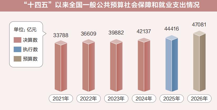 2026年,全國一般公共預算教育支出安排4.58萬億元、增長5.4%;全國一般公共預算衛生健康支出安排2.26萬億元、增長5.2%;全國一般公共預算社會保障和就業支出安排4.71萬億元、增長6.0%,城鄉居民基礎養老金月最低標準再提高20元……一組組數據彰顯民生領域財政持續投入力度。
