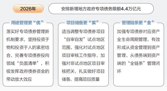 2026年,新增地方政府債務限額5.2萬億元,其中,新增地方政府專項債務限額4.4萬億元,支持建設重大項目、置換隱性債務、消化政府拖欠賬款等。