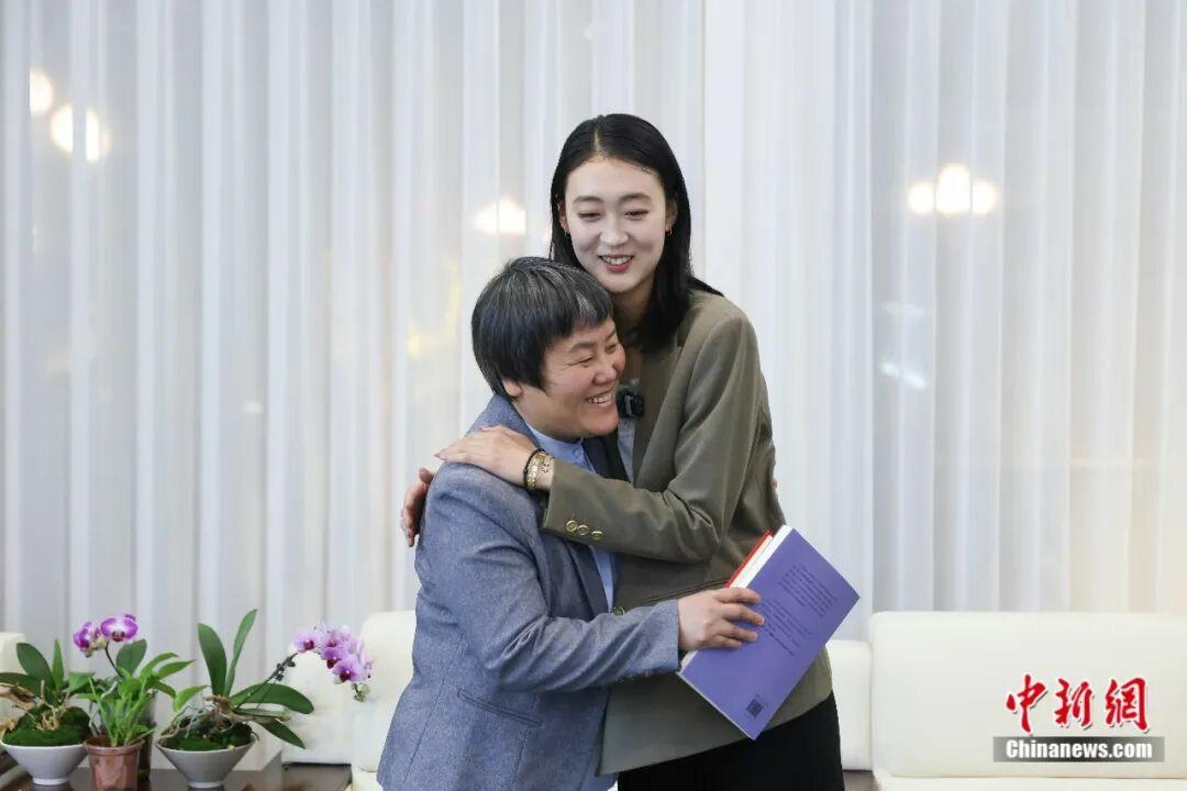 全國人大代表、河南省內(nèi)黃縣馬上鄉(xiāng)李石村“微光書苑”發(fā)起人李翠利接受中新社記者專訪。 圖為中新社記者采訪后擁抱李翠利。中新社記者 楊郁然 攝
