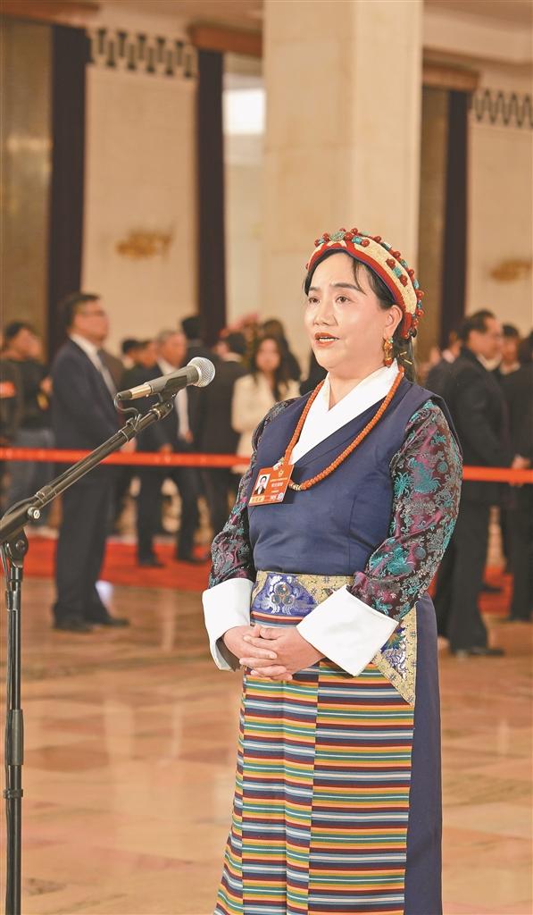 圖為3月7日,全國政協十四屆四次會議第二場“委員通道”集體采訪活動在人民大會堂舉行。這是住藏全國政協委員明吉措姆接受媒體采訪。記者 旦增旺姆 攝