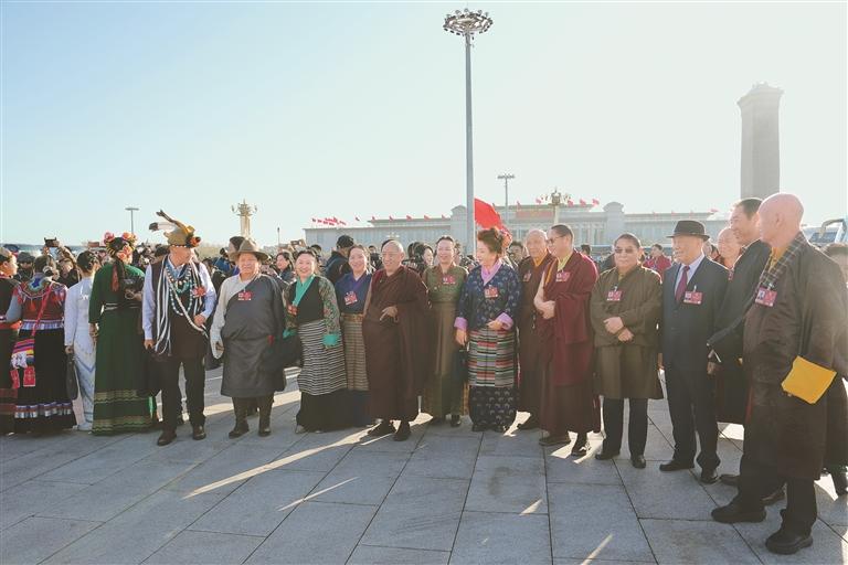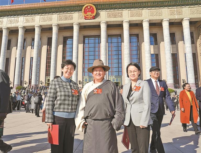 圖為住藏全國政協委員扎西頓珠與其他全國政協委員一起合影。本報記者 陶玥 攝