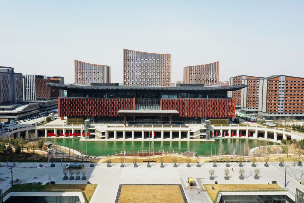 雄安商務服務中心是新區首個標志性城市建筑群,建筑風格以東方美學立體展現雄安特色風貌,功能包括酒店、專家公寓、商業等。2022年底,該中心投入使用。通過綠色建筑技術的集成與創新,這里實現了綠建三星標準全覆蓋,項目預計每年可節約用電1100萬度。這是2022年3月28日拍攝的雄安商務服務中心。
