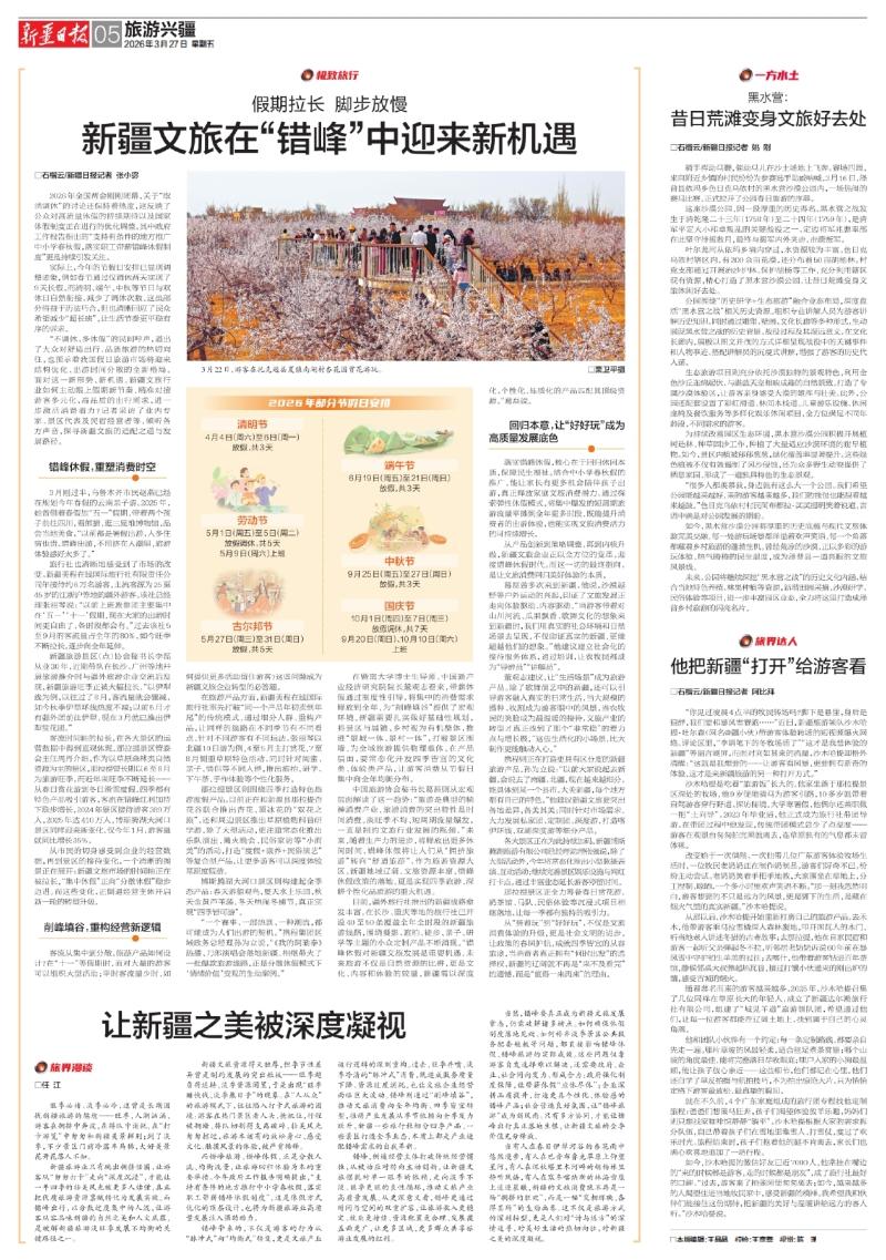 “不調(diào)休,多休假”的民間呼聲,道出了大眾對(duì)舒適出行、品質(zhì)旅游的熱切向往,也預(yù)示著我國(guó)假日旅游市場(chǎng)將迎來結(jié)構(gòu)優(yōu)化、出游時(shí)間分散的全新格局。面對(duì)這一新形勢(shì)、新機(jī)遇,新疆文旅行業(yè)如何主動(dòng)跟上假期新節(jié)奏,精準(zhǔn)對(duì)接游客多元化、高品質(zhì)的出行需求,進(jìn)一步激活消費(fèi)潛力?記者采訪了業(yè)內(nèi)專家、景區(qū)代表及民宿經(jīng)營(yíng)者等,傾聽各方聲音,探尋新疆文旅的適配之道與發(fā)展路徑。