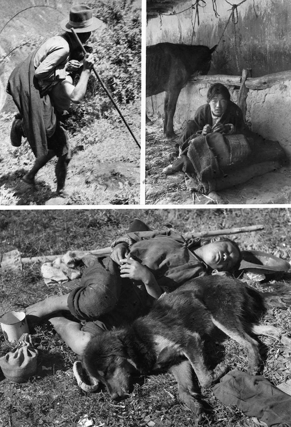 上圖左:西藏農奴制度下的“人背人”(即農奴像牲畜一樣背馱著農奴主)差役。上圖右:和牲口同住的農奴。下圖:農奴益西欽沛服勞役后與犬同眠。新華社發(1992年9月19日發)
