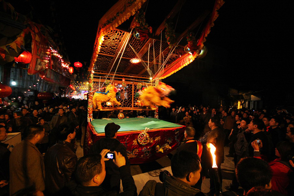線獅表演中,獅子朝舞臺左右飛去的動作,稱為“穿山躍”。其動作幅度之大、速度之快,令人稱奇。受訪者供圖 霍童線獅是寧德的傳統(tǒng)民俗文化項目,數條繩索構成了線獅的“神經系統(tǒng)”,表演者在后臺拉線操控,加上繡球、燈光、噴火、鑼鼓的配合,帶給觀眾惟妙惟肖的享受。 歷經十幾代傳承人的改良創(chuàng)新,霍童線獅由最初的“單獅”,發(fā)展成4種表演形式;表演時呈現(xiàn)出坐立、蹲臥、跳躍、翻騰、擺首、舐毛、搶球等更多姿態(tài),配以新興的聲、光、電效果,表演引人入勝。除了盲視表演,霍童線獅的制作工序同樣為人稱道。一只線獅從準備原材料到最終完工,大致需要“搭骨架、火烤、填充、定型、上色、裝飾”等多個步驟,如此大大小小的工序做下來,就算是老藝人也要一個月方能完成。 2006年,霍童線獅入選國家級非物質文化遺產名錄后,霍童建設了線獅館。相比過去僅在燈會上一年神秘地露臉一次,如今線獅有了更為廣闊的舞臺。每天中午,陳姓、黃姓兩大家族的藝人在線獅館內輪流登臺,一周表演6天,迎接來自五湖四海的游客。線獅的傳承也打破了“傳男不傳女”“傳內不傳外”的規(guī)定。如今,霍童當地的學校正大力推廣線獅進校園活動并邀請線獅隊的老藝人擔任輔導老師,加大裝備投入、每周開展相應的活動,為傳統(tǒng)線獅注入活力。 |