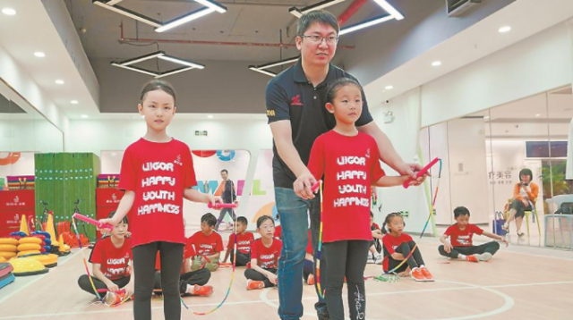 魏文在指導(dǎo)小朋友跳繩。