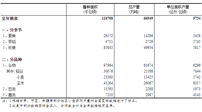糧食播種面積增加1056萬畝,增長0.6% 2020年,各地加大對糧食生產(chǎn)的支持力度,層層壓實糧食生產(chǎn)責任,積極落實各項補貼政策,提高農(nóng)民種糧積極性,糧食播種面積止跌回升。全國糧食播種面積17.52億畝,比上年增加1056萬畝,增長0.6%。 稻谷播種面積增加,玉米持平,小麥減少。2020年,全國谷物播種面積14.69億畝,比上年增加176萬畝,增長0.1%。其中,稻谷4.51億畝,比上年增加573萬畝,增長1.3%。面對突如其來的新冠肺炎疫情,為確保糧食安全穩(wěn)定生產(chǎn),國家加大對水稻生產(chǎn)的扶持力度,落實各項支農(nóng)惠農(nóng)、種糧補貼、糧食最低收購價等政策,全年雙季稻播種面積比上年增加756萬畝,增長5.3%,成為糧食播種面積擴大的主要原因。玉米播種面積基本穩(wěn)定。受華北地下水超采區(qū)實施季節(jié)性休耕限采及市場需求等因素影響,小麥播種面積比上年減少522萬畝。 豆類面積大幅增加,薯類面積穩(wěn)中有增。2020年,全國豆類播種面積1.74億畝,比上年增加778萬畝,增長4.7%。受大豆振興計劃政策帶動,大豆播種面積1.48億畝,比上年增加825萬畝,增長5.9%。2020年,全國薯類播種面積1.08億畝,比上年增加103萬畝,增長1.0%。 糧食單產(chǎn)增加0.9公斤,增長0.2% 2020年,全國大部農(nóng)區(qū)氣候條件較為適宜,病蟲害發(fā)生較輕,有利于糧食作物生長發(fā)育和產(chǎn)量形成。盡管部分地區(qū)洪澇災害和臺風對生產(chǎn)造成一定影響,但各地加強田間管理,積極抗災減災,農(nóng)業(yè)災情對糧食生產(chǎn)影響有限。糧食產(chǎn)量實割實測抽樣調(diào)查顯示,2020年,全國糧食作物單產(chǎn)382公斤/畝,每畝產(chǎn)量比上年增加0.9公斤,增長0.2%。 小麥單產(chǎn)增加,玉米持平,稻谷略減。2020年,全國谷物單產(chǎn)420公斤/畝,每畝產(chǎn)量比上年增加1.6公斤,增長0.4%,其中,小麥單產(chǎn)383公斤/畝,每畝產(chǎn)量比上年增加7.5公斤,增長2.0%;玉米單產(chǎn)421公斤/畝,與上年基本持平;受南方局部洪澇災害的影響,稻谷單產(chǎn)470公斤/畝,每畝產(chǎn)量比上年減少1.0公斤,下降0.2%。 豆類、薯類單產(chǎn)水平均有所提高。2020年,豆類單產(chǎn)132公斤/畝,每畝產(chǎn)量比上年增加3.2公斤,增長2.5%,其中,大豆單產(chǎn)132公斤/畝,每畝產(chǎn)量比上年增加3.0公斤,增長2.3%。2020年,薯類單產(chǎn)276公斤/畝,每畝產(chǎn)量比上年增加7.1公斤,增長2.6%。 糧食產(chǎn)量增加113億斤,增長0.9% 2020年,夏糧和早稻產(chǎn)量分別為2857億斤和546億斤,比上年增加25億斤和21億斤;秋糧產(chǎn)量9987億斤,增加67億斤。全年糧食總產(chǎn)量達到13390億斤,增加113億斤,增長0.9%。 稻谷、小麥產(chǎn)量增加,玉米略減。2020年,全國谷物產(chǎn)量12335億斤,比上年增加61億斤,增長0.5%。其中,稻谷產(chǎn)量4237億斤,比上年增加45億斤,增長1.1%;小麥產(chǎn)量2685億斤,比上年增加13億斤,增長0.5%;玉米產(chǎn)量5213億斤,比上年減少2億斤。 豆類、薯類產(chǎn)量均增加。豆類產(chǎn)量458億斤,比上年增加31億斤,增長7.3%。其中,大豆產(chǎn)量392億斤,比上年增加30億斤,增長8.3%。薯類產(chǎn)量597億斤,比上年增加21億斤,增長3.6%。 分地區(qū)來看,多數(shù)省(區(qū)、市)糧食增產(chǎn)。2020年,全國31個省(區(qū)、市)中26個增產(chǎn),其中,河南、山東、山西、河北、新疆糧食產(chǎn)量均增加10億斤以上。 |