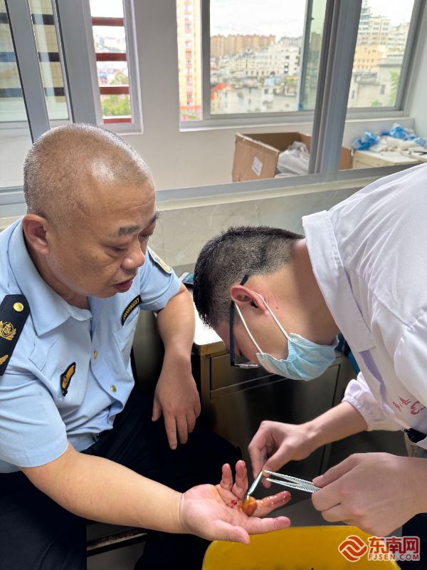 執法員處理傷口。寧德高速公路行政執法支隊供圖 救援過程中,高方彬同志以極高的專業素養與臨危不懼的勇氣一把抓起消防水龍頭,毫不猶豫地沖向火場。在緊張激烈的撲救過程中,他的手指不慎被水龍頭上的鐵片劃傷,鮮血頓時染紅手掌。但高方彬同志強忍著劇痛,堅守在滅火最前線,與其他救援人員并肩作戰。 經過近一小時的奮力撲救,火勢最終被完全控制并徹底撲滅。在整個救援過程中,三大隊執法人員與消防隊員密切配合,高效處置火情,有力保障了服務區內人員和財產安全。 此次火災雖事發突然,但在執法人員和消防隊員的迅速響應和科學處置下,火情得到及時控制。事故未造成人員傷亡和重大財產損失,但也再次警示廣大駕駛員和運輸企業:務必嚴格遵守交通安全法規,加強貨物裝載和運輸環節的安全管理,確保行車安全。 |