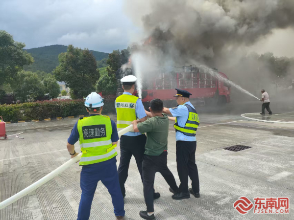 執法員撲滅火情。寧德高速公路行政執法支隊供圖 執法人員抵達現場時,發現車牌號為皖LG8790的貨車正被大火吞噬。若不及時控制火勢,將嚴重威脅服務區內人員和車輛的安全。面對險情,屏南中隊高方彬、鄭武沉著應對,迅速與消防隊員制定救援方案。