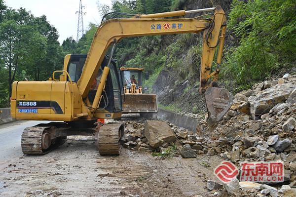 7月21日晚,省道308線沙縣區長紅村路段發生山體崩塌,石塊影響道路安全通行。 東南網7月23日訊(通訊員 徐紫瑩)近日,短時強降雨突襲沙縣區,落石、倒伏樹木占據多處路面,影響通行安全。三明市公路事業發展中心沙縣分中心全體職工晝夜不息,在暴雨與險情中展開與時間的競速賽。 7月21日傍晚,一陣強降雨剛剛過去,高砂公路站職工在國道205線龍江村路段發現倒伏樹木,占據半幅路面。他們披上雨衣、提起油鋸便沖入雨中,不顧大風掀起的雨衣和沾滿鋸末的臉頰。經過半小時疾速清理,他們將道路安全隱患清除。 當晚9時許,在省道308線長紅村路段,隨著一聲巨響——約300m3土石轟然傾瀉,石塊攔住了過往群眾的通行道路,現場車隊排起長龍。大洛公路站站長林新清到達現場后,安排專人觀察邊坡穩定情況,并組織人員對現場進行安全布控。鏟車就位后立即開展清理落石工作,在各方配合下,近兩小時緊張作業后,該路段恢復通行狀態。