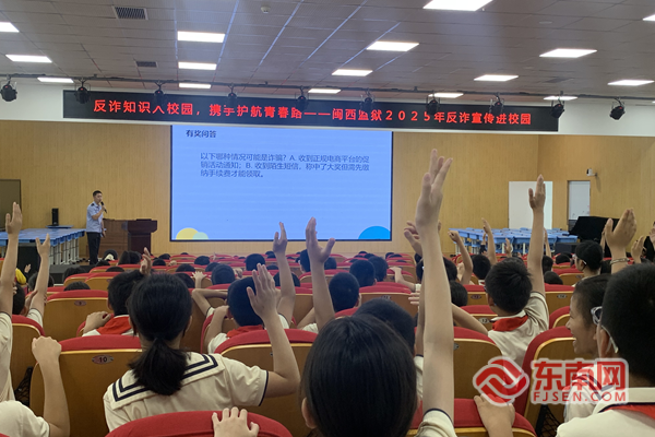 在閩西監獄民警進校園開展法治宣傳教育活動中,孩子們踴躍參與其中,積極和民警互動 在龍巖二中,退役軍人、閩西監獄六分監獄民警陳玉文以“鑄強國魂,立報國志”為主題,為千余名師生作國防教育宣講。他從《中華人民共和國國防法》切入,系統介紹中國武裝力量結構和各軍種職能,更以親身經歷的軍旅生活,拉近青少年與大國國防的距離。他從“海上守護戰機起降”到“高墻內守護社會底線”的崗位轉變,生動詮釋了軍人與警察兩重使命背后的同一份忠誠。 在松濤小學,閩西監獄四分監區民警以“平安進校園,安全我護航”為主題,為四年級學生帶來一堂實用的法治安全課。圍繞交通安全、用火用電、食品安全等內容,民警通過交通標志競猜、視頻案例剖析等形式,增強學生自我保護意識。結合未成年人保護相關法律,他們還將“游戲皮膚詐騙”“追星打賞騙局”等熱點問題轉化為通俗易懂的案例,引導學生知法守法、遠離陷阱。