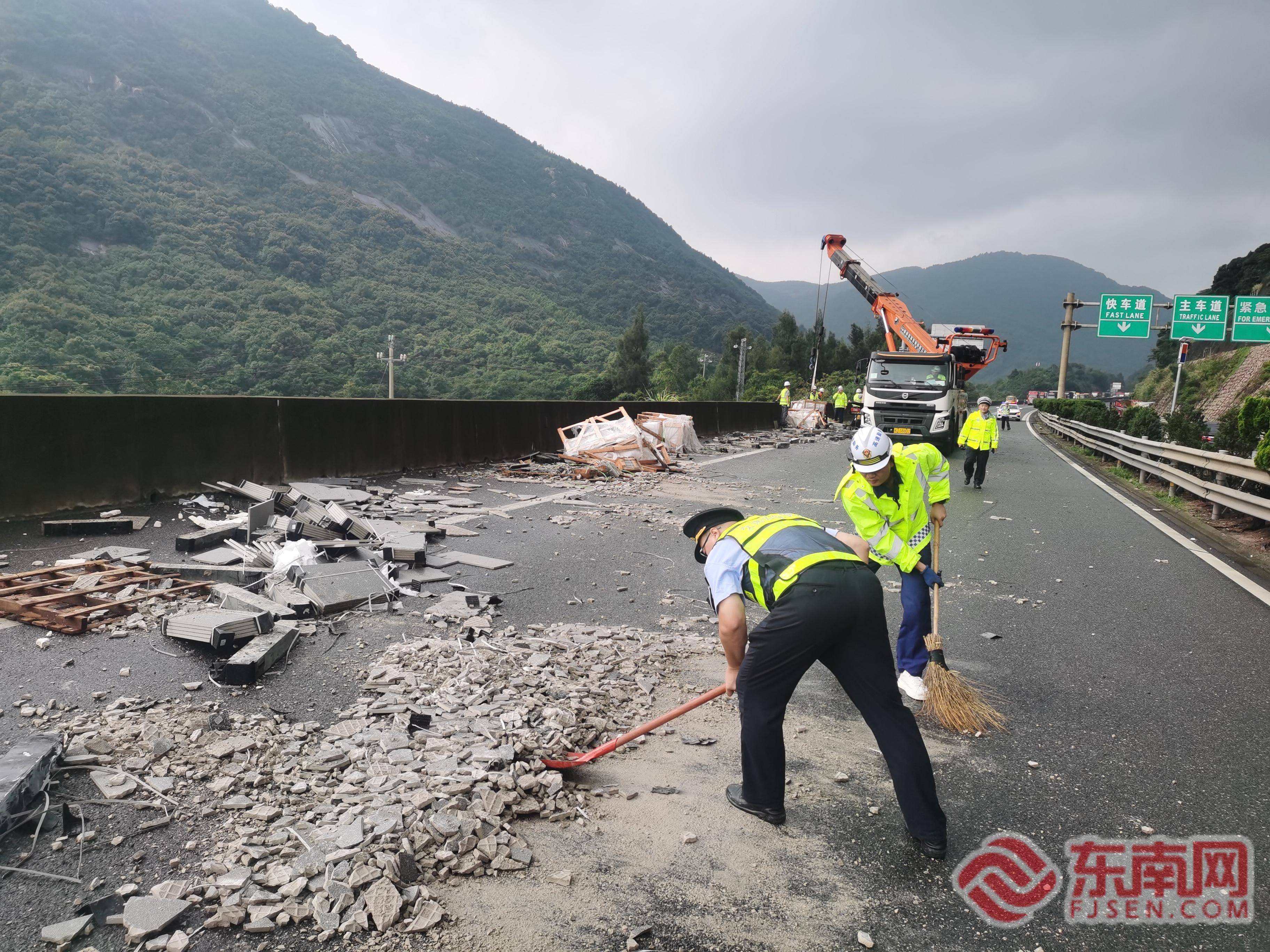 處理灑落物事故。寧德高速執法支隊供圖 8時13分,路網中心傳來的警報打破了晨間的寧靜。霞浦中隊執法人員僅用3分鐘完成出勤準備,于8時16分疾馳向事故現場。8時45分抵達時,破碎瓷磚將道路完全封堵。執法人員迅速在事故后方200米處架起反光錐筒組成的“生命防線”,與隨后趕來的高速交警、路勤人員組成臨時搶險隊。9時整,隨著第一車碎瓷磚被裝載清運,這場“清障大會戰”正式打響。
