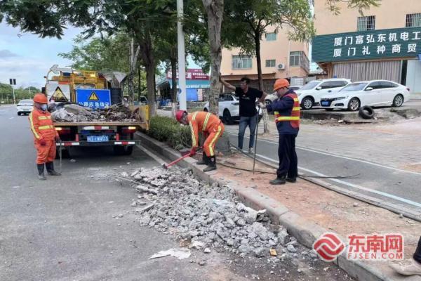 公路部門組織拆除(廈門公路供圖) 發(fā)現(xiàn)該情況后,翔安公路部門與區(qū)交通執(zhí)法大隊迅速啟動聯(lián)動執(zhí)法機(jī)制。工作人員現(xiàn)場勘查確認(rèn)了違規(guī)事實,并依據(jù)《公路安全保護(hù)條例》等法律法規(guī),立即組織專業(yè)力量,調(diào)用施工機(jī)械對該處違規(guī)硬化的混凝土路面進(jìn)行徹底破除與清理,有效恢復(fù)道路原貌,及時消除了安全隱患。