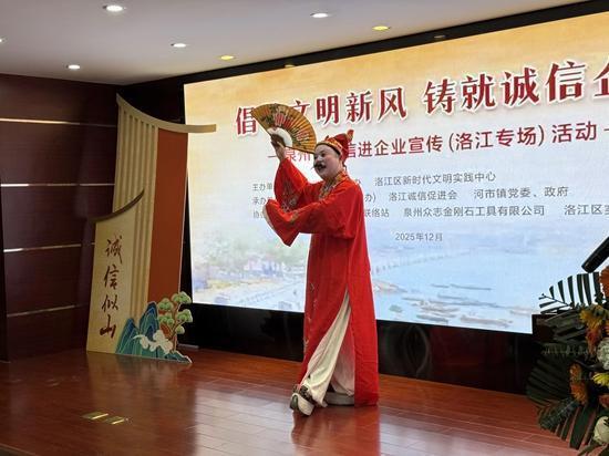 講古《黃奕聰文明誠信故事》。吳雅藝攝 12月9日,“倡導(dǎo)文明新風(fēng) 鑄就誠信企業(yè)”泉州市誠信進(jìn)企業(yè)宣傳(洛江專場)活動舉行。活動旨在深入學(xué)習(xí)宣傳貫徹黨的二十屆四中全會精神和習(xí)近平總書記關(guān)于誠信建設(shè)的重要論述,弘揚(yáng)誠信文化,提升企業(yè)及員工的文明素養(yǎng)和誠信意識,營造“知信、用信、守信”的良好營商環(huán)境。 活動主辦方強(qiáng)調(diào),要堅持以信立業(yè),筑牢企業(yè)發(fā)展根基。希望廣大企業(yè)自覺將誠信作為核心價值追求,貫穿于生產(chǎn)經(jīng)營各環(huán)節(jié)、全過程。要嚴(yán)守法律法規(guī),恪守契約精神,保障產(chǎn)品與服務(wù)品質(zhì)。要切實保障員工合法權(quán)益,依法誠信納稅,積極參與社會公益,主動履行社會責(zé)任,塑造負(fù)責(zé)任、有擔(dān)當(dāng)?shù)牧己闷髽I(yè)形象;要注重以文化人,培育企業(yè)誠信文化。希望企業(yè)將誠信建設(shè)融入企業(yè)文化,通過宣傳教育、典型選樹、活動浸潤等方式,使誠信理念深入人心。要充分發(fā)揮企業(yè)黨組織和黨員先鋒模范作用,在企業(yè)內(nèi)部營造“人人講誠信、事事守信用”的濃厚氛圍,使誠信成為員工的自覺行動和企業(yè)的文化基因;要勇于示范引領(lǐng),共建良好信用生態(tài)。希望優(yōu)秀企業(yè)爭當(dāng)行業(yè)誠信表率,主動作出公開承諾,自覺接受社會監(jiān)督。要加強(qiáng)行業(yè)自律,帶動合作伙伴共建誠信共同體,形成“守信光榮、失信可恥”的行業(yè)風(fēng)尚。 活動現(xiàn)場,企業(yè)代表宣讀《洛江區(qū)文明誠信企業(yè)倡議書》,號召廣大企業(yè)自覺踐行誠信經(jīng)營理念,擔(dān)當(dāng)社會責(zé)任。隨后,一系列富有泉州地方特色、緊扣誠信主題的文藝節(jié)目與宣講精彩上演——泉州高甲戲傳承人王培煥帶來的《痟公子講誠信》,以傳統(tǒng)戲曲形式生動演繹誠信故事;宣講員楊熠以《誠信之光照亮文明洛江》為題,深刻闡釋了誠信建設(shè)的時代價值與現(xiàn)實意義;洛江區(qū)實驗小學(xué)學(xué)生為現(xiàn)場觀眾帶來了精彩的木偶劇表演,通過蔡襄建洛陽橋的歷史故事傳遞堅守承諾的寶貴品質(zhì);福建省非遺傳承人黃德模以親切的鄉(xiāng)音講述了本土企業(yè)家黃奕聰?shù)恼\信佳話;最后,《文明之花》舞蹈表演為活動畫上了優(yōu)美句點(diǎn)。 主辦方相關(guān)負(fù)責(zé)同志表示:“活動以群眾喜聞樂見的方式傳播誠信文化,將誠信理念春風(fēng)化雨般融入觀眾心田,有效強(qiáng)化了企業(yè)的誠信主體意識和員工的職業(yè)道德觀念,進(jìn)一步推動‘知信、用信、守信’在全社會蔚然成風(fēng)。” 活動由中共泉州市委文明辦、洛江區(qū)新時代文明實踐中心主辦,洛江區(qū)委宣傳部(文明辦)、洛江區(qū)誠信促進(jìn)會、河市鎮(zhèn)黨委、政府承辦,泉州眾志金剛石工具有限公司協(xié)辦。 |