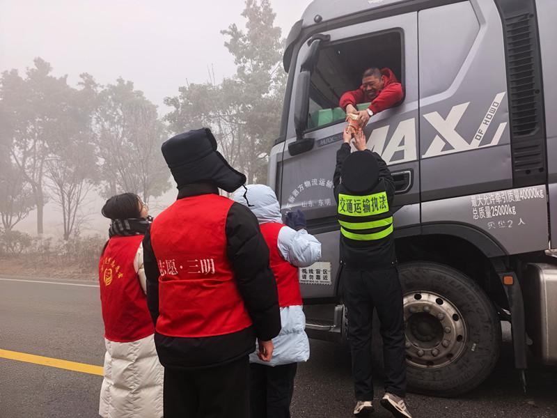 “師傅們,這邊有熱水、有吃的,需要什么自己拿。”身著紅色志愿服的志愿者在茫茫大霧中格外醒目。聽見招呼聲,原本坐在駕駛室等待的司機們聞聲而來,漸漸在桌前聚攏。一位老師傅端起熱氣騰騰的開水,暖了暖凍得發僵的雙手;志愿者主動為司機們泡好泡面,香氣很快飄散開來。一杯杯冒著白氣的熱水,一碗碗泡好的方便面,一盒盒溫熱的牛奶和面包,被遞到一雙雙有些冰冷的手中。來自江西的貨車司機李師傅捧著熱水,連聲道謝:“這真是雪中送炭啊!”