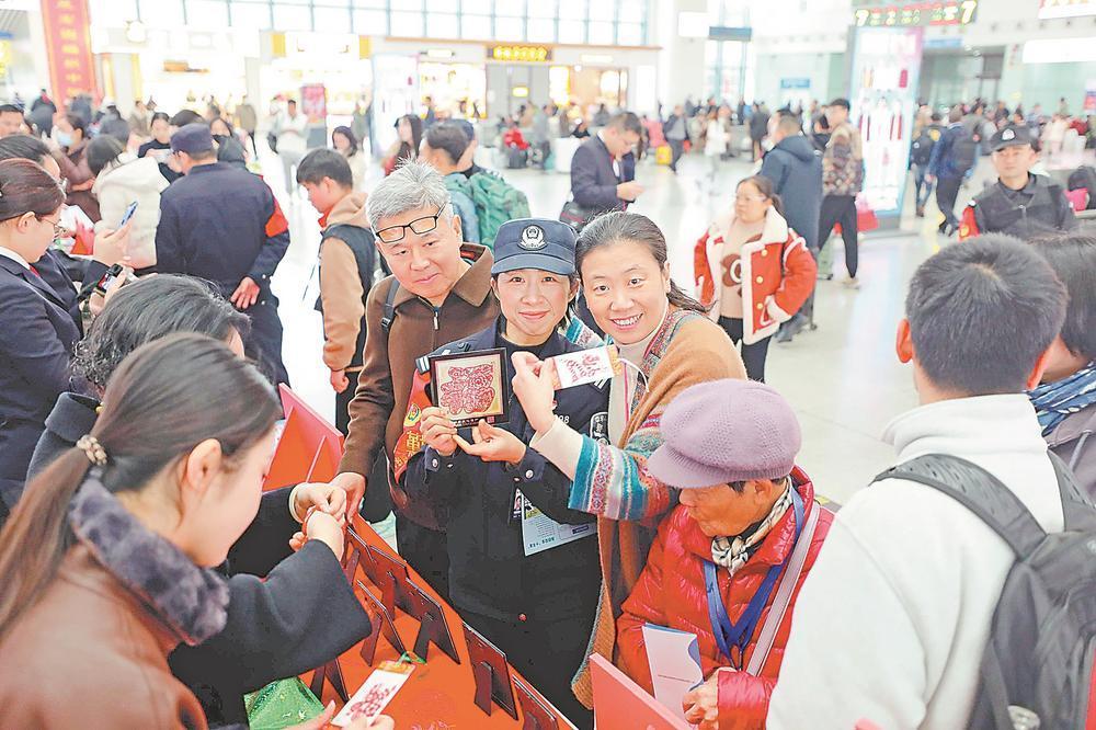 2月2日,春運(yùn)首日,在福州火車站候車大廳,寫春聯(lián)、剪窗花等傳統(tǒng)民俗活動(dòng)吸引不少旅客駐足參與。銀航 陳歡歡 攝