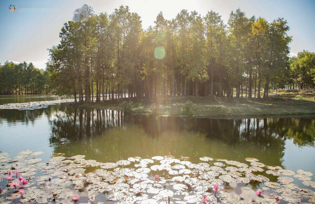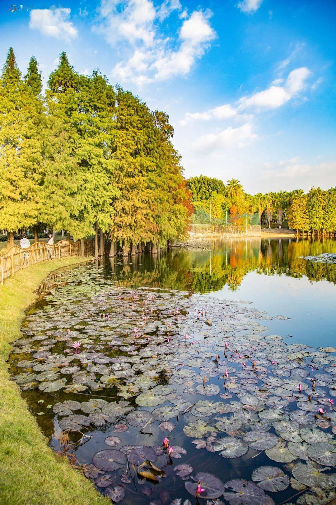 藍天碧水,波光粼粼,落羽杉環湖而立,各有姿態,一步一景,相互呼應。周圍曲徑通幽,綠樹成蔭。
