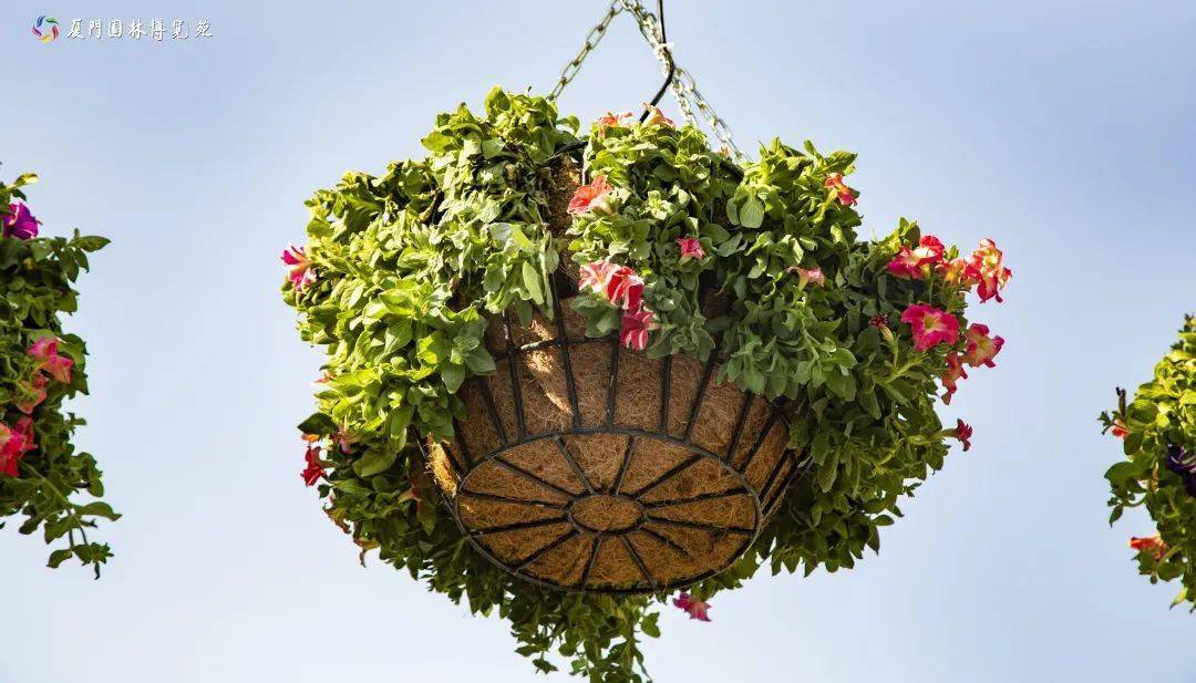 通往澳門園的石橋上懸掛了60個吊籃,籃內混種不同顏色的垂吊矮牽牛,株型飽滿,開滿艷麗的花朵。