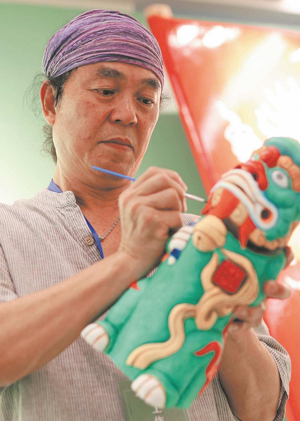 金門藝術(shù)家王明宗現(xiàn)場(chǎng)給風(fēng)獅爺上色。陳建和 攝