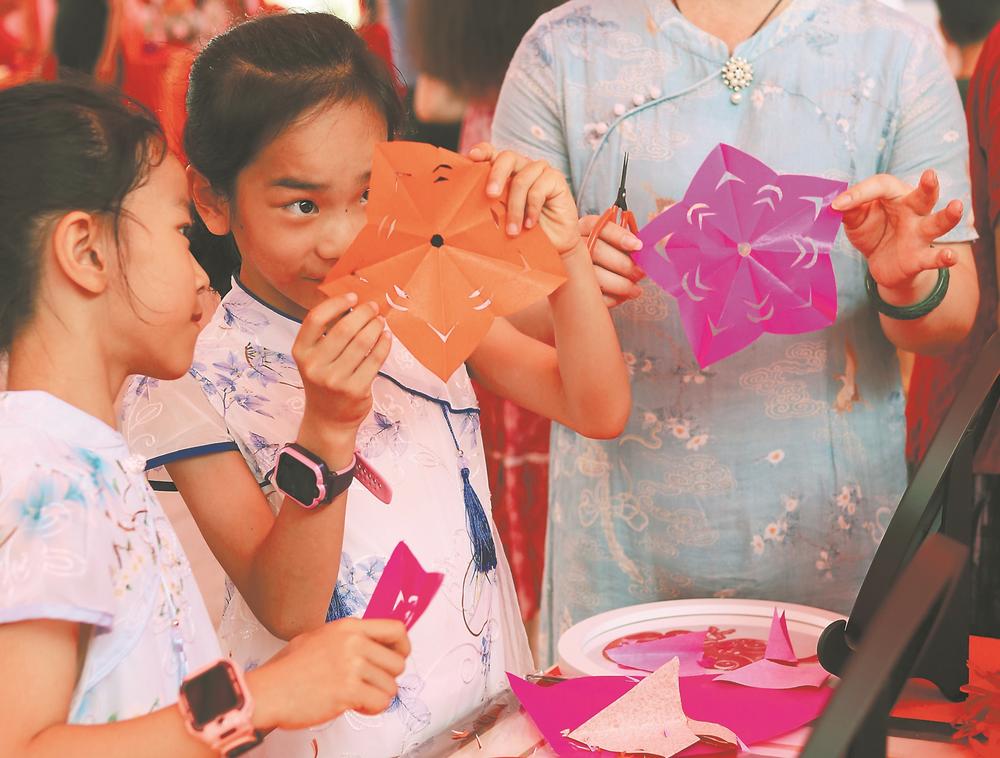 孩子們現(xiàn)場(chǎng)體驗(yàn)剪紙樂趣。陳建和 攝 |