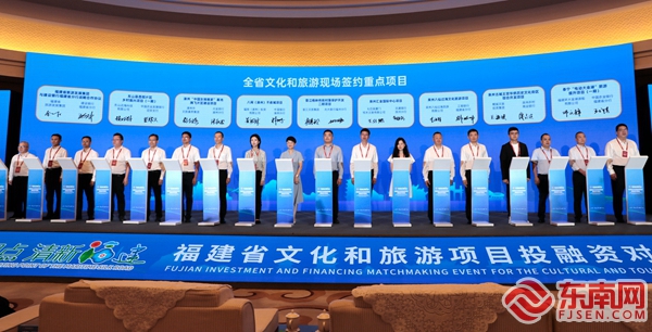 活動現場。東南網記者 林婕 攝 在福建省重點文旅項目簽約儀式上,共有36個文旅重點項目集中簽約,包括區域協作、政企合作、產業對接、招商合作、銀企合作等項目。其中招商合作項目27個,總投資267.43億元,銀企合作項目9個,融資額度83.35億元。簽約的招商引資項目中,總投資10億元以上項目有9個,包括德化觀音岐古鎮項目(50億元,合同),永春安騰十里桃源項目(30億元,合同),泉港惠嶼電影島項目(30億元,合同),石獅東方萬佳城市新天地項目(23億元,合同),南安大盈溪流域田園風光建設項目(20億元,合同),福州中洲島文商旅綜合體項目(10億元,意向)。銀企合作項目中,福建省旅游發展集團與建行福建省分行戰略合作協議,融資50億元。 在上午召開的全省文旅經濟發展大會上,簽約重大項目17個、投融資約236億元。今年以來,全省各地深化拓展省委“深學爭優、敢為爭先、實干爭效”行動,掀起拼文旅經濟、抓項目建設的熱潮。各地先后有106個文化和旅游重點招商項目達成合作共識,總投資1183.42億元;其中10億元以上項目38個,總投資1023.73億元。14個銀企合作項目成功對接,總投資249.23億元,融資需求162.9億元。 對接會上,還舉行了福建省文旅經濟產業鏈招商重點項目專欄上線儀式。該專欄在省文旅廳官網推出,內容涵蓋產業政策、重點招商項目、中國-海峽創新項目成果交易平臺文化和旅游項目、建設項目成果展示等板塊,著力構建線上線下一體、永不落幕的項目對接、成果展示、文旅推介的嶄新平臺。