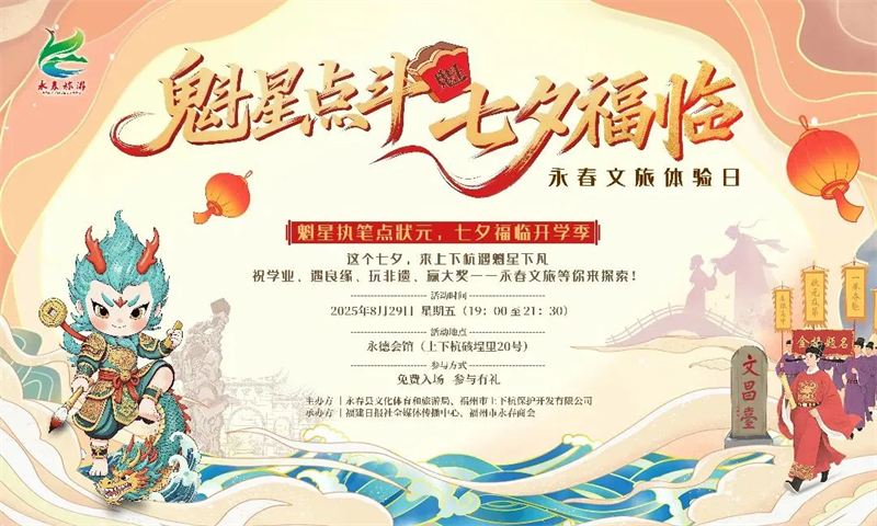 鵲橋之約巧遇魁星點(diǎn)斗 千年非遺碰撞此刻心動(dòng) 情意綿綿七夕夜邂逅元?dú)鉂M滿開學(xué)季 將擦出怎樣的花火? 8月29日(周五) 19:00-21:30 相約福州上下杭星安河畔 “魁星點(diǎn)斗·七夕福臨”永春文旅體驗(yàn)日 邀您一起—— 以浪漫相遇,以文化啟程!