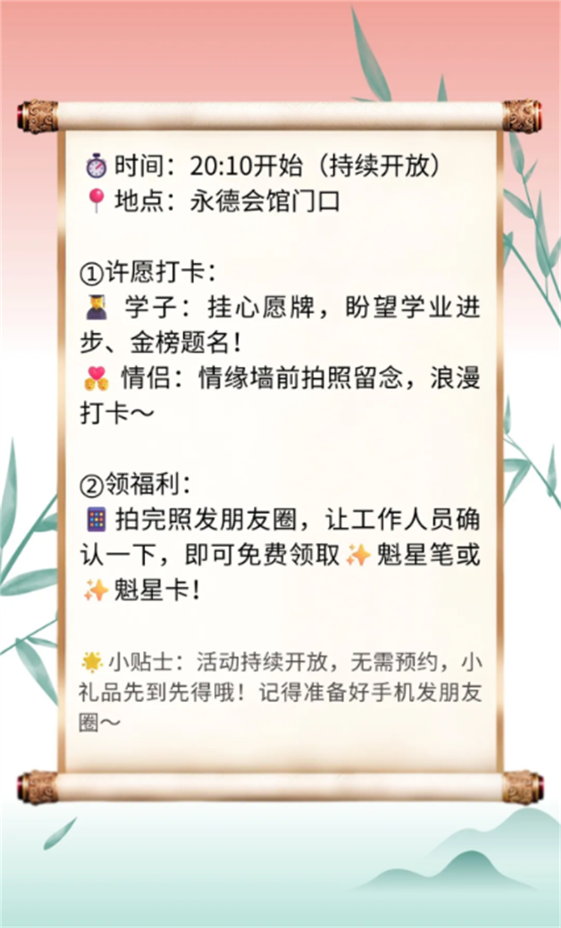 屆時(shí) 百年僑厝永德會(huì)館將化身文藝?yán)寺臻g 為你呈上“愛意款款+文運(yùn)滿滿” 雙拼自助方案! 兩種美好,一次滿足! 魁星巡游·非遺快閃