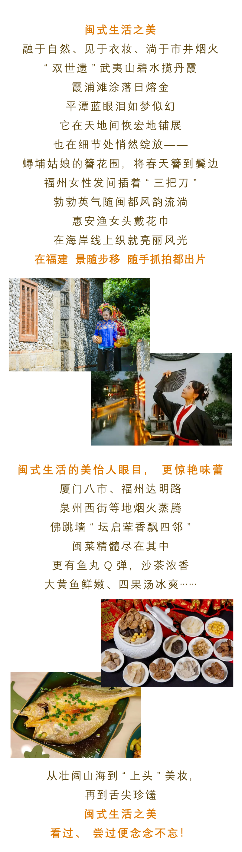 這里沒有單調的日復一日 有的是看不夠的風景、聽不完的傳奇 和濃得化不開的幸福煙火氣 閩式生活,每一面都“超帶感” 值得您親自領略這片有福之地的別樣風情!