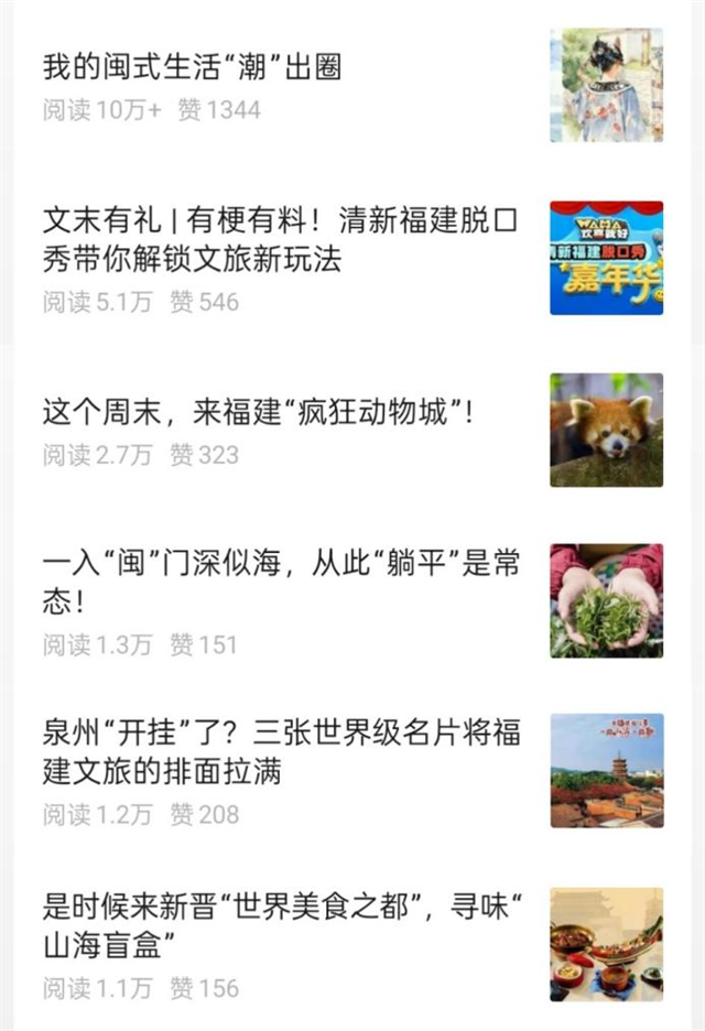 11月,"清新福建 文旅之聲"微信公眾號獲得51萬+總閱讀量、6565次點贊、22216次轉發、3540次在看的亮眼成績,用94條精彩推文,向網友展現了福建文旅的獨特魅力。 一、核心話題策劃:我的閩式生活"潮"出圈 11月運營的核心主題是#我的閩式生活,通過系列化、專題化的內容策劃,全方位展現福建文旅新場景。其中,11月20日推出的重點推文《我的閩式生活“潮”出圈》閱讀量突破10萬+,采用SVG排版+GIF+手繪+AI的多元呈現方式,刷新視覺效果,以文化角度闡述福建有點“潮”,推介福建冬日各地美景、美食、游玩路線、精彩演出節目,成為當月爆款。 二、熱點事件聯動:泉州美食之都+鄧紫棋演唱會 泉州入選“世界美食之都”:11月,泉州正式啟動申創“世界美食之都”,成為當月文旅熱點。推文《是時候來新晉“世界美食之都”,尋味“山海盲盒”》等文章,通過美食視角展現泉州文旅魅力。鄧紫棋演唱會熱點:11月15-16日,鄧紫棋I AM GLORIA世界巡回演唱會在福州海峽奧體中心體育場開唱,成為福建文旅的重要引流事件。推文《在鄧紫棋的歌聲里,解鎖山海福建》等文章,將演唱會與福建文旅資源巧妙結合,實現流量轉化。 三、脫口秀品牌打造:幽默解鎖文旅新玩法 脫口秀活動展演:緊跟福建省文化和旅游廳的脫口秀活動展演,第一時間向線上用戶用幽默的方式解鎖福建文旅。推文《文末有禮 | 有梗有料!清新福建脫口秀帶你解鎖文旅新玩法》閱讀量突破5萬+,成為當月第二爆款。線上+線下裂變宣傳:通過線上活動贈送"小佳《蜉蝣直上》圖書"等禮品,實現“線上+線下”裂變宣傳,讓脫口秀成為福建文旅營銷的新名片。品牌化運營:福建省文化和旅游廳打造“WAHA歡喜就好”福建文旅脫口秀品牌,通過幽默風趣的脫口秀形式講述福建文旅故事,全網傳播覆蓋超1.65億人次,成為全國文旅營銷的優秀范例。 四、熱文內容矩陣:14篇萬+閱讀量文章 11月共產生14篇閱讀量突破1萬+的文章,形成熱文內容矩陣,其中13篇來自達人共創,更好地滿足了用戶對個性化、品質化文旅信息的需求。