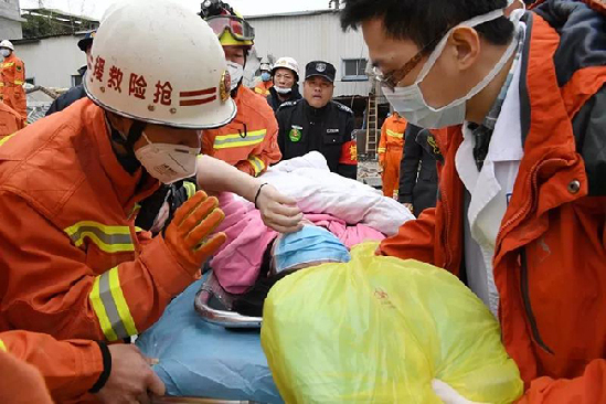 又一名被困者被救出 救援工作進行4個多小時后,15名被埋壓人員被營救出來,其中14名被埋壓群眾生命體征平穩,1名因傷勢過重送至醫院后經搶救無效死亡。救援過程中,莆田、泉州、廈門支隊的消防救援力量先后趕到,醫療、建筑安全評估專業人員、氣割、大型挖掘機等各方增援隊伍也在現場等候,隨時做好配合救援行動。 加速夜戰——不放過任何救援希望