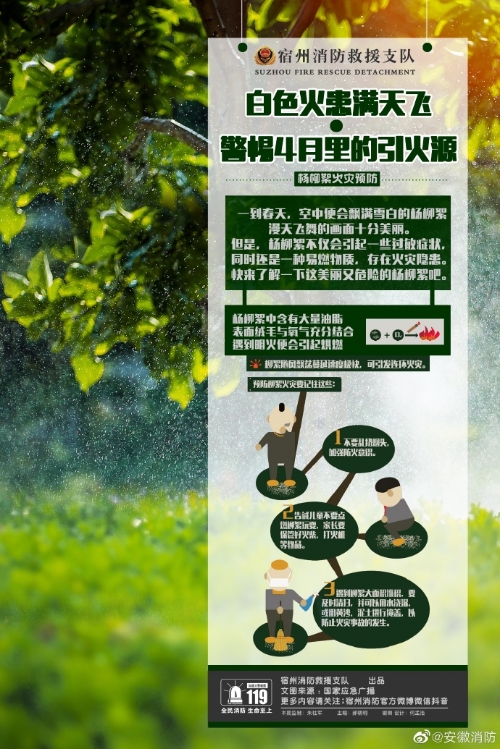 每年4、5月份,楊柳絮滿天飄。隨著氣溫逐漸升高,天干物燥,加上柳絮質地輕盈,只需微風便能順勢飄起,一旦點燃,極有可能因蔓延迅速而殃及周遭,導致更大的火災事故發生。提醒大家:一定要謹防楊柳絮引發的火災。