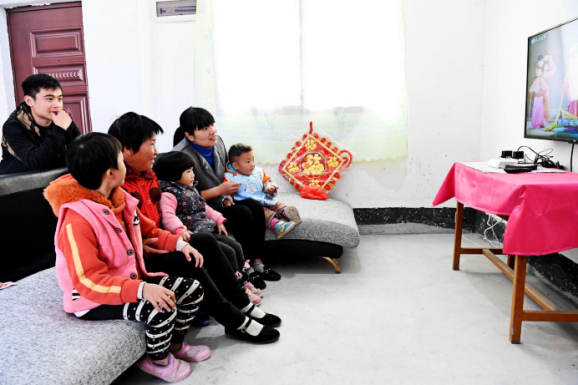 貧困戶一家人在新房中觀看春節聯歡晚會