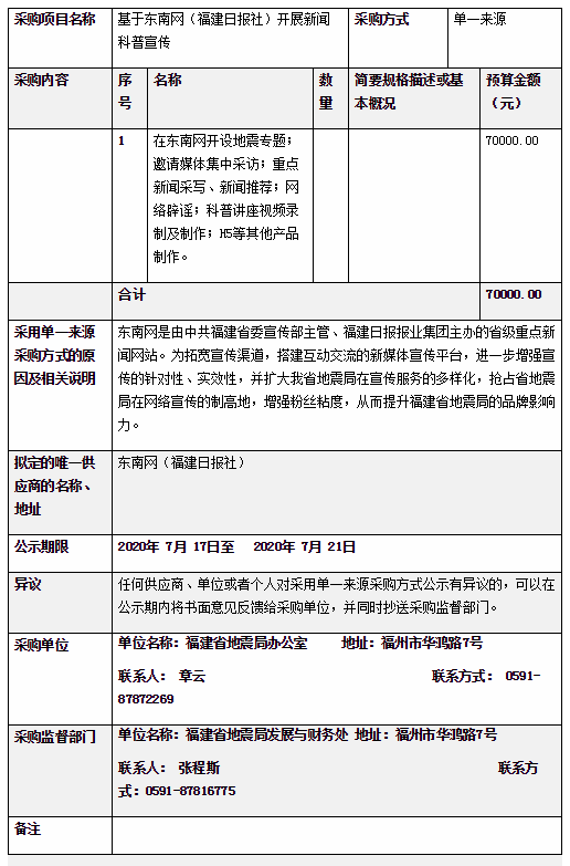 基于東南網(福建日報社)開展新聞科普宣傳采用單一來源采購公示