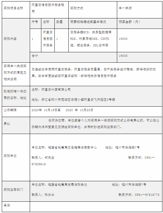 應急指揮與宣教中心阿里云信息技術服務單一來源采購公告