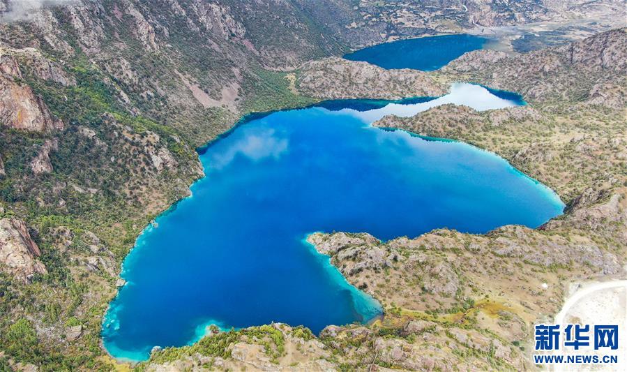 三色湖”中被稱為黑湖的湖水,近觀呈黑色,而從空中俯瞰,則更多呈現明亮的藍(9月26日攝,無人機照片)。新華社記者 晉美多吉 攝