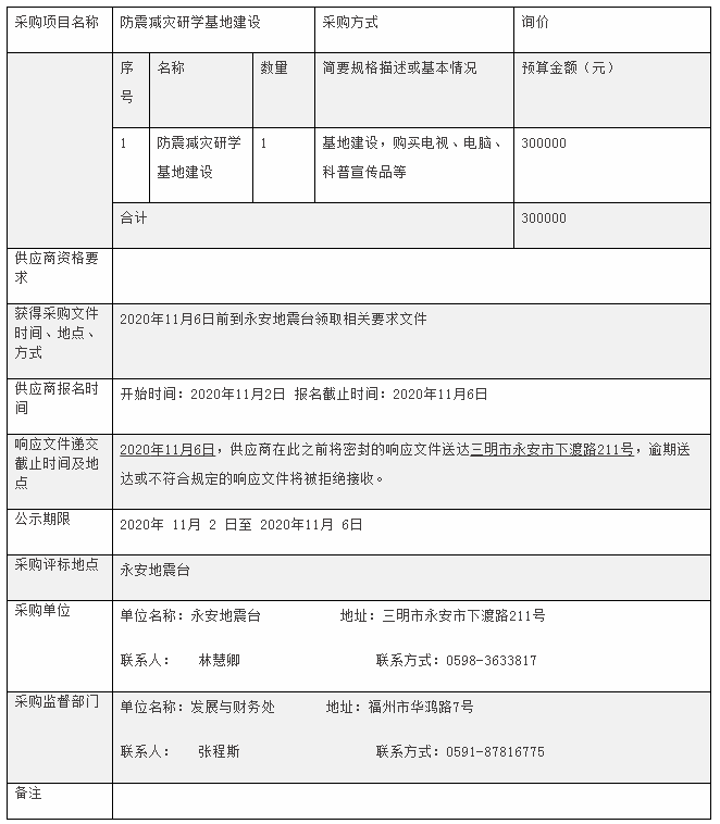 依據《福建省地震局采購管理實施細則》要求,現對永安地震臺“防震減災研學基地建設”進行公開采購,現歡迎有意向、合格的供應商前來參加。