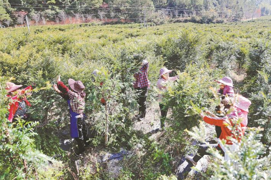 12月12日,在位于明溪縣夏陽鄉紫云村的紫杉園“南方紅豆杉一號”苗木種植基地內,30多位村民正在剪紅豆杉苗木枝葉。紫杉園公司是明溪縣生物醫藥產業項目之一,紅豆杉是提煉抗腫瘤原料藥紫杉醇的原材料,“南方一號”紫杉醇含量比普通紅豆杉高出10倍以上。2016年,公司流轉閑置土地1600余畝,連片種植紅豆杉,通過“公司+基地+農戶”模式,為紫云村提供80多個務工崗位,助力公司、村民、村財三增收。
