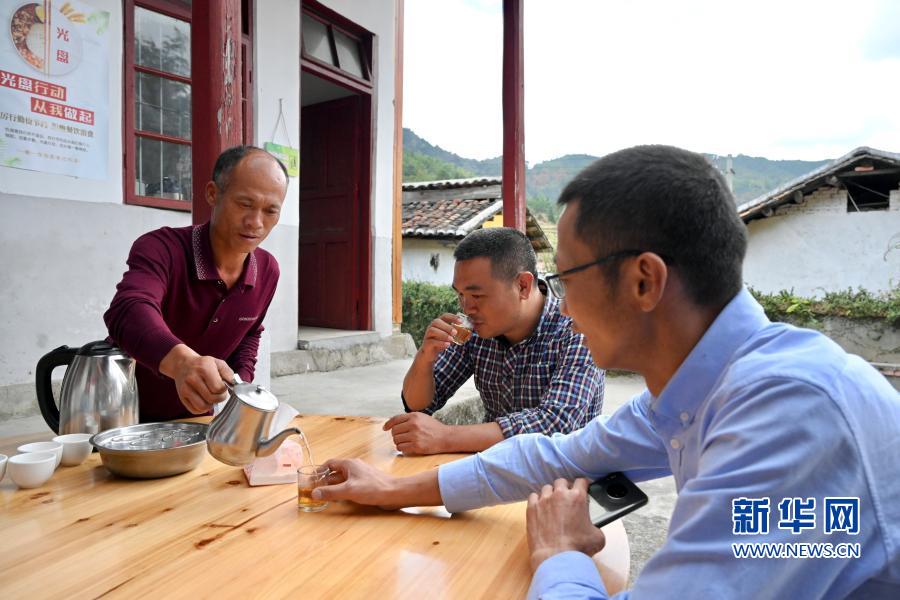 11月19日,承包村里紅軍食堂而脫貧的嶺下村村民鄧平青(左)為客人倒茶水。
