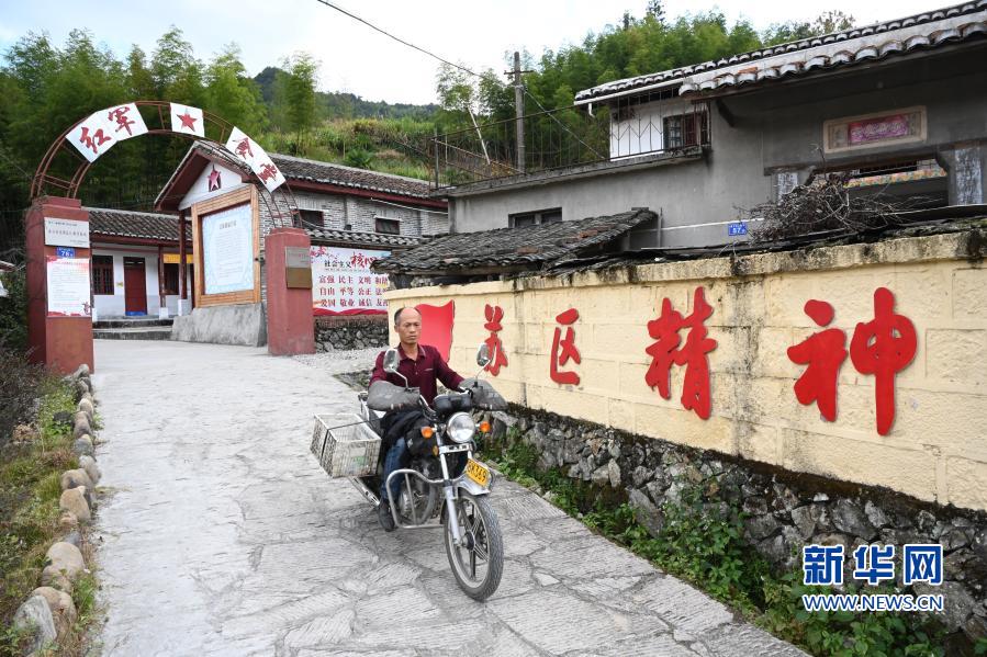 11月19日,承包村里紅軍食堂而脫貧的嶺下村村民鄧平青騎車外出。新華社記者姜克紅 攝