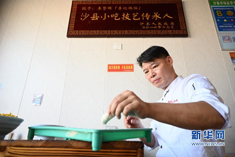 11月18日,在福建省三明市沙縣文昌美食街,沙縣小吃技藝傳承人李賢錦在包鍋貼。新華社記者 姜克紅 攝