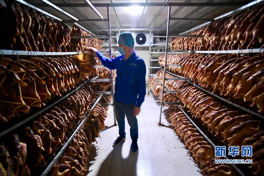 11月18日,沙縣小吃產業園一家企業工作人員查看庫房中的熏鴨。新華社記者 姜克紅 攝