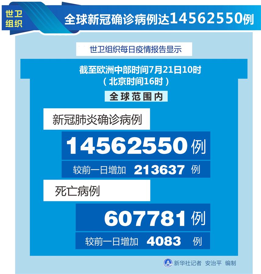世衛組織每日疫情報告顯示,截至歐洲中部時間21日10時(北京時間16時),全球確診病例較前一日增加213637例,達到14562550例;死亡病例增加4083例,達到607781例。