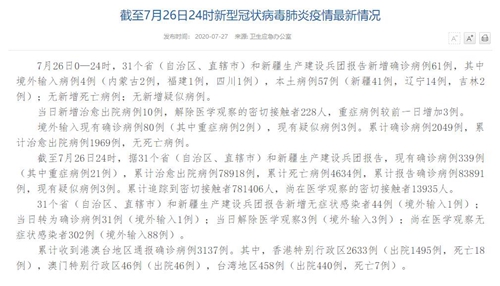人民網北京7月27日電(董童)國家衛生健康委于今日在官網發布的《截至7月26日24時新型冠狀病毒肺炎疫情最新情況》(以下簡稱“情況”)提出,7月26日0—24時,31個省(自治區、直轄市)和新疆生產建設兵團報告新增確診病例61例,其中境外輸入病例4例(內蒙古2例,福建1例,四川1例),本土病例57例(新疆41例,遼寧14例,吉林2例);無新增死亡病例;無新增疑似病例。當日新增治愈出院病例10例,解除醫學觀察的密切接觸者228人,重癥病例較前一日增加3例。