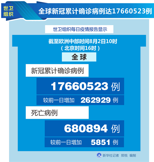 世衛組織每日疫情報告顯示,截至歐洲中部時間2日10時(北京時間16時),全球確診病例較前一日增加262929例,達到17660523例;死亡病例增加5851例,達到680894例。