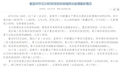 人民網北京8月6日電(董童)國家衛生健康委于今日在官網發布的《截至8月5日24時新型冠狀病毒肺炎疫情最新情況》(以下簡稱“情況”)提出,8月5日0—24時,31個省(自治區、直轄市)和新疆生產建設兵團報告新增確診病例37例,其中境外輸入病例7例(上海5例,山東1例,陜西1例),本土病例30例(新疆27例,遼寧3例);無新增死亡病例;無新增疑似病例。當日新增治愈出院病例10例,解除醫學觀察的密切接觸者474人,重癥病例較前一日減少2例。