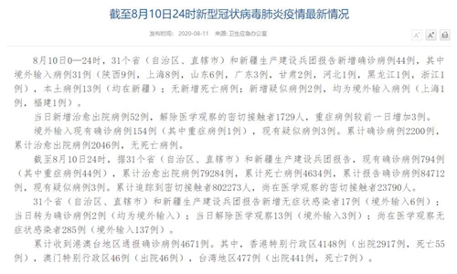 人民網北京8月11日電(董童)國家衛生健康于今日在官網發布的《截至8月10日24時新型冠狀病毒肺炎疫情最新情況》(以下簡稱“情況”)提出,8月10日0—24時,31個省(自治區、直轄市)和新疆生產建設兵團報告新增確診病例44例,其中境外輸入病例31例(陜西9例,上海8例,山東6例,廣東3例,甘肅2例,河北1例,黑龍江1例,浙江1例),本土病例13例(均在新疆);無新增死亡病例;新增疑似病例2例,均為境外輸入病例(上海1例,福建1例)。當日新增治愈出院病例52例,解除醫學觀察的密切接觸者1729人,重癥病例較前一日增加3例。