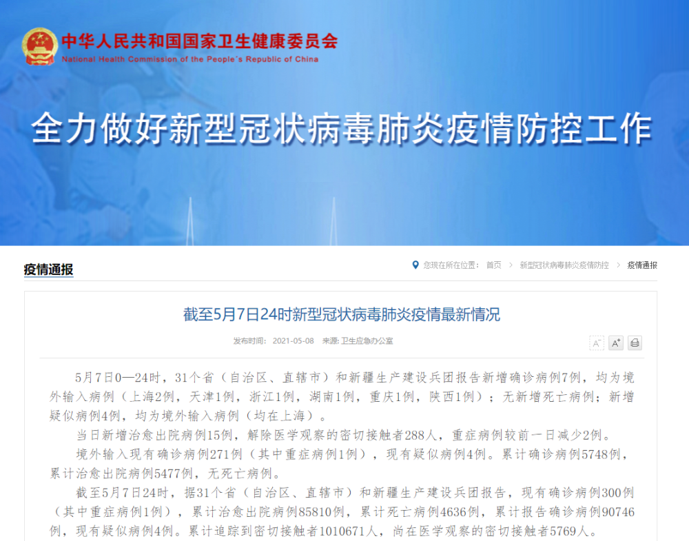 截至5月7日24時新型冠狀病毒肺炎疫情最新情況 5月7日0—24時,31個省(自治區(qū)、直轄市)和新疆生產(chǎn)建設(shè)兵團報告新增確診病例7例,均為境外輸入病例(上海2例,天津1例,浙江1例,湖南1例,重慶1例,陜西1例);無新增死亡病例;新增疑似病例4例,均為境外輸入病例(均在上海)。 當日新增治愈出院病例15例,解除醫(yī)學(xué)觀察的密切接觸者288人,重癥病例較前一日減少2例。 境外輸入現(xiàn)有確診病例271例(其中重癥病例1例),現(xiàn)有疑似病例4例。累計確診病例5748例,累計治愈出院病例5477例,無死亡病例。 截至5月7日24時,據(jù)31個省(自治區(qū)、直轄市)和新疆生產(chǎn)建設(shè)兵團報告,現(xiàn)有確診病例300例(其中重癥病例1例),累計治愈出院病例85810例,累計死亡病例4636例,累計報告確診病例90746例,現(xiàn)有疑似病例4例。累計追蹤到密切接觸者1010671人,尚在醫(yī)學(xué)觀察的密切接觸者5769人。 31個省(自治區(qū)、直轄市)和新疆生產(chǎn)建設(shè)兵團報告新增無癥狀感染者8例(均為境外輸入);當日轉(zhuǎn)為確診病例2例(均為境外輸入);當日解除醫(yī)學(xué)觀察11例(均為境外輸入);尚在醫(yī)學(xué)觀察的無癥狀感染者313例(境外輸入306例)。 累計收到港澳臺地區(qū)通報確診病例13028例。其中,香港特別行政區(qū)11801例(出院11473例,死亡210例),澳門特別行政區(qū)49例(出院49例),臺灣地區(qū)1178例(出院1077例,死亡12例)。