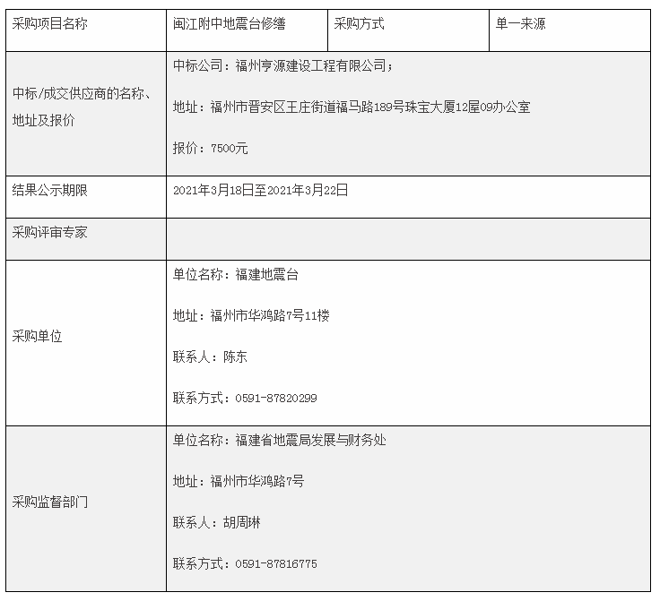 福建地震臺閩江附中地震臺修繕采購結果公示